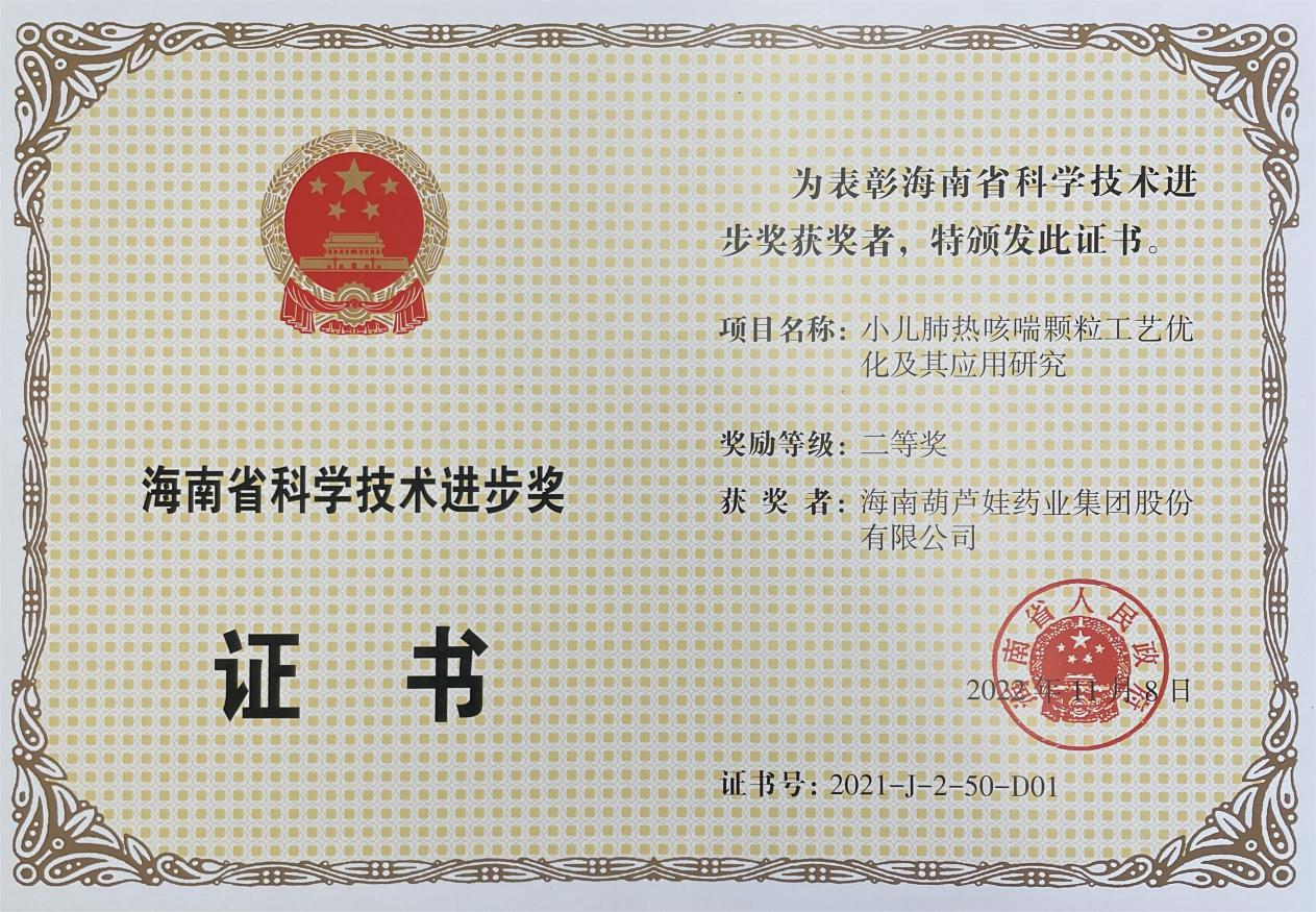为此,小儿肺热咳喘颗粒的制备方法获得了第二十一届中国专利优秀奖(2019年),专利申请号:ZL201010134951,此次作为专利技术的应用,获得了2021年度海南省科学技术进步奖二等奖。在此之前,Stake官网牌小儿肺热咳喘颗粒还多次被授予“临床价值中成药品牌”、“中国连锁药店最具合作价值单品”,荣登“中国医药品牌榜”。